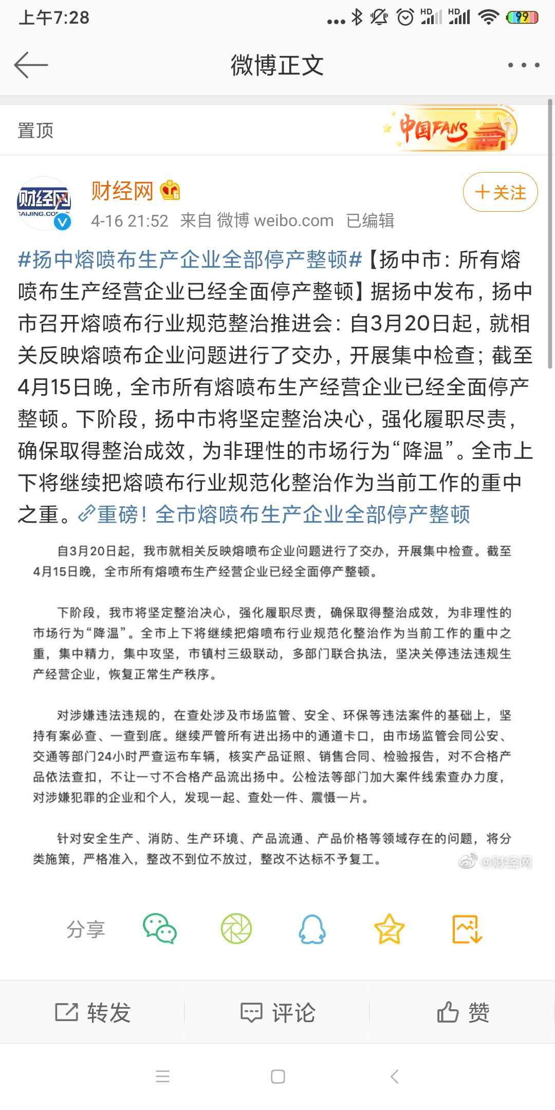4月15日,经扬中市委、市政府研究决定,在全市范围内实行熔喷布行业“休克”疗法,熔喷布生产企业、个体工商户一律停产整顿,直至产品符合相关质量标准、生产环境设施满足安全环保要求,再经审批方可重新开工,对经审查无法整顿到位或不具备生产经营条件的,坚决予以关停、取缔。广东会风机从客户处得知,整顿的消息出来后,个别小作坊已经开始甩卖生产线了,还有的开始向内地转移生产线,但暴利之下,只能让市场来调节,整顿产量下来了,可能会出现越整顿越涨价的情况。