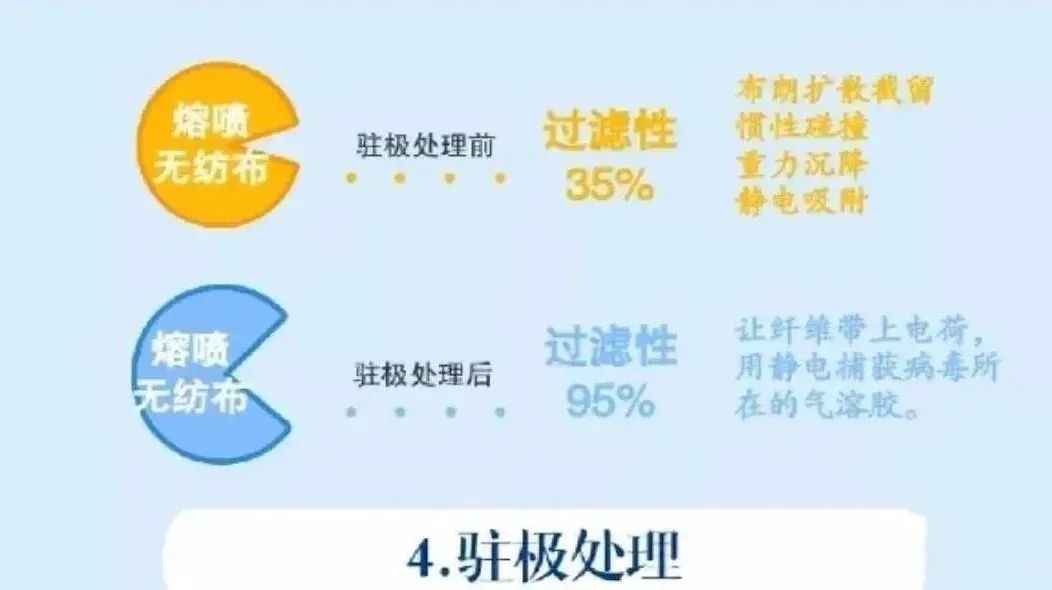 熔喷布之所以过滤效果好,最重要的原因就是静电吸附,才能阻隔病毒。别小看这个静电吸附作用,看上图对比一下,没有静电,熔喷布的过滤效率还不如布呢,只有百分之35。