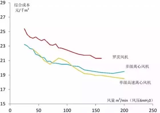 从设备采购成本看,罗茨风机成本最低,多级离心风机居中,单级高速离心风机最高。综合考虑能耗、设备采购及运行维护费用等因素,三种风机的流量与单位综合成本比较见下图。