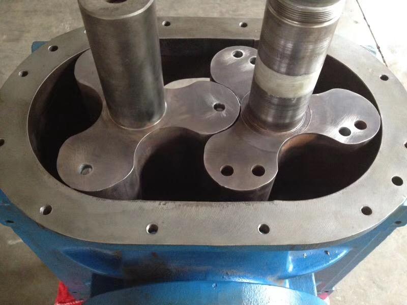 当罗茨鼓风机在运转时,气体进入由两个叶轮和机壳围成的空间内,即气体进入气腔。先进入的气体被一个叶轮和机壳围在进气腔内,此时气体仅仅被围住,而没有被压缩或膨胀,似真空状态。随着叶轮的转动,进气腔的气体被不断带到排气腔,又因两叶轮是相互啮合转动的,随着叶轮的进一步转动,两叶轮将排气腔内气体送至排气口。叶轮连续不断运转,使更多的气体持续送至排气腔,进而由排气口排出机体。罗茨鼓风机的主轴由电动机通过V型带或联轴器带动,主轴通过齿轮箱内同步齿轮的作用,使机体内的两个叶型叶轮相向旋转。叶轮相互之间及叶轮与机体之间有一微小间隙,当两叶轮相向旋转时,叶轮与机壳所围成的进气腔内的气体直接被推送至排气腔后排出机体,达到鼓风的作用。