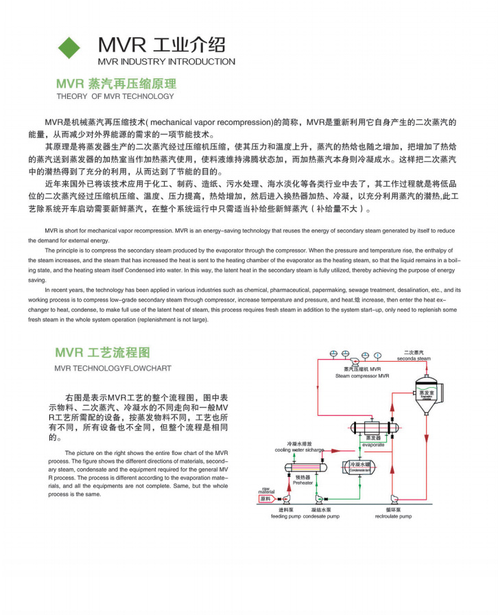 MVR是机械蒸汽再压缩技术(mechanical vapor recompression)的简称,MVR是重新利用它自身产生的二次蒸汽的能置,从而减少对外界能源的需求的一项节能技术。