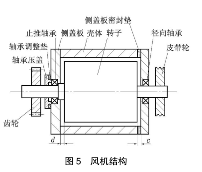 用塞尺法检测转子端面与机壳的轴向间隙。定位端( 齿轮侧)间隙d=0.1~0.2 mm,非定位端( 皮带轮侧)间隙c=0.3~0.5 mm,总间隙的标准是 0.4~0.7mm。